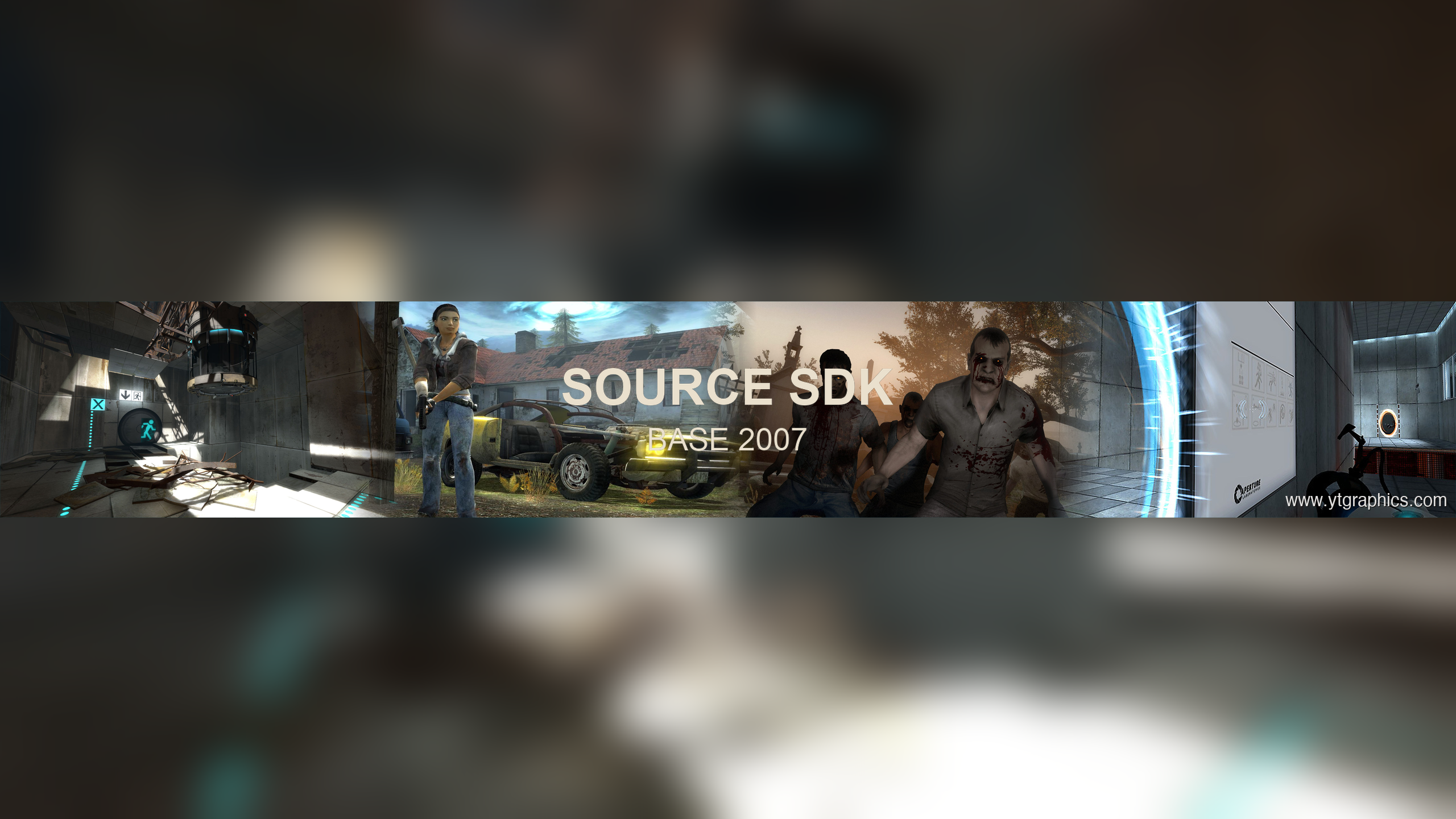 This custom YouTube banner showcases stunning visuals from iconic Source engine games, featuring imagery from Portal 2, Half-Life 2: Episode Two, Left 4 Dead 2, and Portal. The clean, professional design features the Source SDK Base 2007 logo prominently displayed over a dynamic composite strip with a vibrant cyan glow effect that reflects the Source engine’s signature aesthetic. Optimized at 2560×1440 pixels to meet YouTube’s recommended channel art specifications, this banner is perfect for content creators, game developers, modding communities, and gaming channels covering Source engine development, tutorials, or mod showcases.