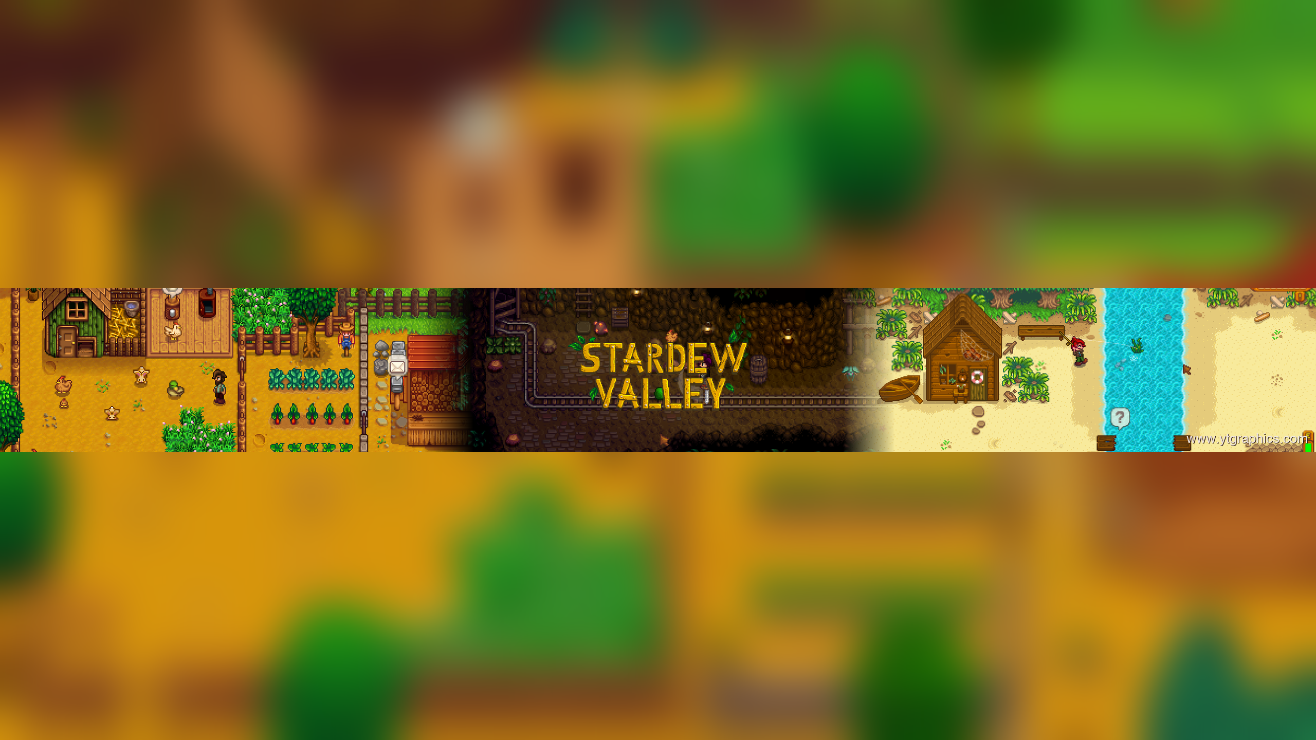 This custom YouTube banner showcases the colorful pixel art world of Stardew Valley, featuring vibrant farm scenes, cozy buildings, and the iconic golden game logo with decorative leaves. Designed specifically for content creators, Let’s Play channels, and farming sim enthusiasts, this professionally crafted banner combines multiple authentic game screenshots into a warm, inviting composition with a soft golden glow effect. Optimized at 2560×1440 pixels to meet YouTube’s recommended channel art specifications with proper safe zones for mobile viewing, this banner is perfect for YouTubers covering Stardew Valley gameplay, farm tours, modding guides, relationship guides, and cozy gaming content.